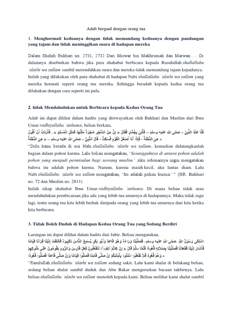 Adab bergaul dengan orang tua. Adab bergaul dengan orang yang lebih tua dimasmis. Pengertian tentang adab secara lebih jelas dapat anda baca pada pengertian adab dalam kitab al bukhari. Di antara bentuk berakhlaq yang mulia dan paling utama adalah berbakti pada orang tua. Kami hanya membahas mengenai adab bergaul dengan orang tua.