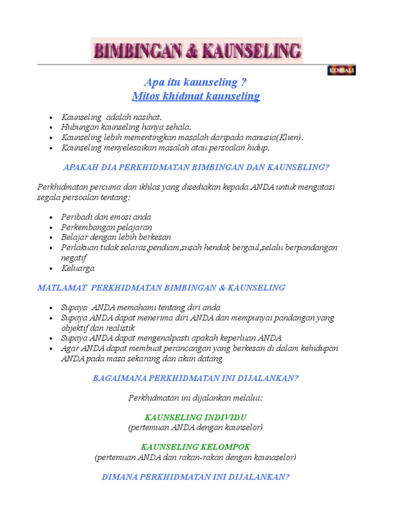 Definisi perkhidmatan bimbingan dan sekolah. Bimbingan dan konseling merupakan terjemahan dari istilah guindance dan counselling dalam bahasa ingris kata guindance berasal dari kata kerja to guide yang mempunyai arti menunjukan membimbing menuntun ataupun membantu hallen 2005 2 sesuai dengan istilahnya maka bimbingan dapat diartikan secara umum sebagai bantuan dan tuntunan namun tidak semua bantuan. Oleh itu peranan kaunseling di peringkat pencegahan awal adalah terhad. Satu perbincangan antara kaunselor terlatih dgn individu atau kelompok kecil yg mengalami kekeliruan dan memerlukan bantuan bersama sama memikirkan dan meneliti bbrp alternatif utk mengatasi sesuatu kecelaruan dan seterusnya melaksanakan alternatif yg dipilih.