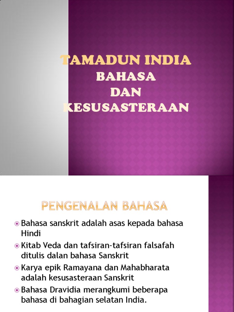 Penggunaan bahasa dari bahasa hindu banyak dijadikan asas kepada kesusasteraan. Tamadun india bahasa dan kesusasteraan bahasa dan kesusasteraan. Dua epik terkenal ialah mahabharata dan ramayana. Bahasa masyarakat dravidia adalah telegu malayalam dan kannada manakala indo aryan ialah sanskrit.