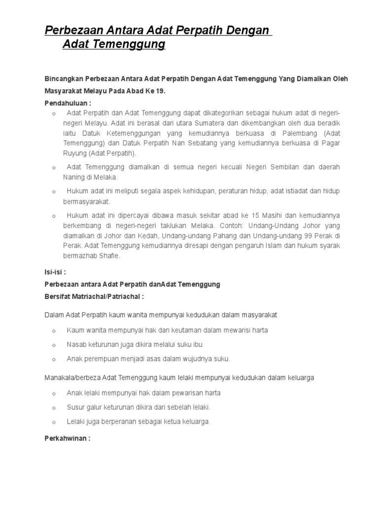 Bincangkan perbezaan antara adat perpatih dengan adat temenggung yang diamalkan oleh masyarakat melayu pada abad ke 19. Adat perpatih are customary laws which originated from the minangkabau highlands in sumatra indonesia. Terdapat dua jenis hukum adat yang diamalkan di negeri negeri melayu sebelum campur tangan british iaitu adat perpatih dan adat temenggung. Adat perpatih dan adat temenggung dapat dikategorikan sebagai hukum adat di negeri negeri melayu.