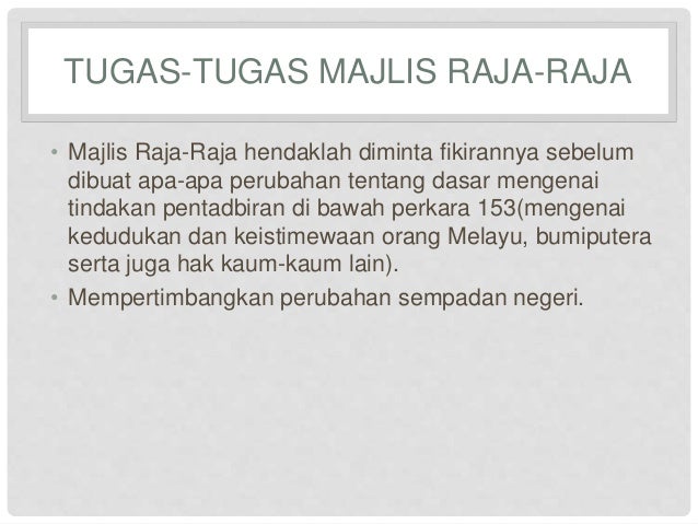 Fungsi majlis raja raja bukan sahaja agung tetapi unik kerana majlis ini adalah institusi tunggal yang sedemikian rupa wujud di dunia pada masa kini. 3 1 komponen utama sistem kerajaan malaysia majlis raja raja merupakan badan rasmi yang paling tinggi kedudukan dan statusnya dalam negara badan ini dianggotai oleh sembilan sultan orang melayu dan empat orang gabenor atau yang dipertua negeri badan ini dipimpin oleh ydpa antara bidang tugas utama majlis raja raja adalah seperti yang berikut. Penggunaan mohor besar raja raja carta organisasi mantan penyimpan mohor besar raja raja ketua pegawai maklumat cio peranan majlis raja raja pengenalan kedudukan majlis raja raja dalam pemerintahan negara malaysia fungsi budibicara majlis raja raja. Fungsi tugas utama dan bidang kuasa.