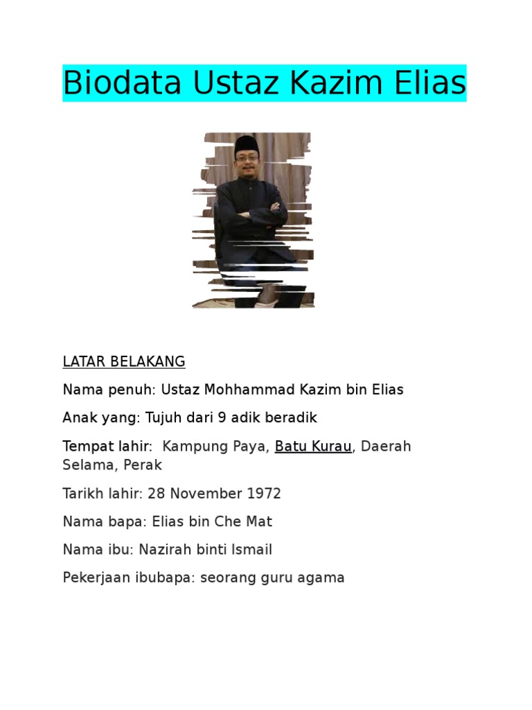 28 november 1972 umur. Biodata ustaz kazim elias ustaz kazim dilahirkan di kampung paya daerah selama perak pada 28 noevember 1972 merupakan anak ke 7 dari dari 9 adik beradik. Dari pasangan elias bin che mat dan nazirah binti ismail iaitu seorang guru agama di sekolah di batu kurau. Kampung paya batu kurau mukim selama perak.