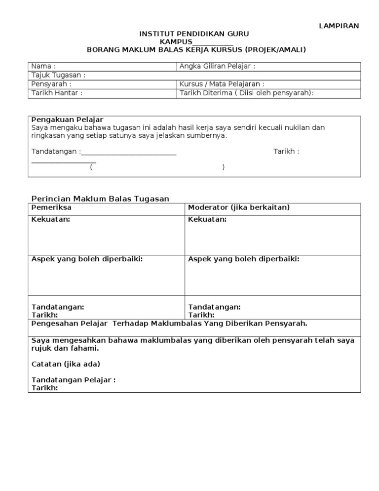 Borang maklum balas kursus. Institut pendidikan guru kampus ilmu khas borang maklum balas kerja kursus tugasan nama pelajar. Kampus sarawak borang maklum balas kerja kursus projek amali nama. Pim 3112 tarikh hantar. Pengakuan pelajar saya mengaku tugasan ini adalah hasil kerja saya sendiri kecuali nukilan dan ringkasan yang.