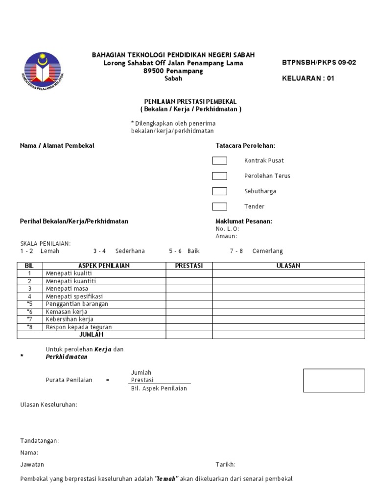 Contoh Borang Penilaian Prestasi Pembekal