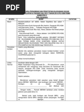 Contoh teks ucapan perasmian penutupan sukan. Teks pengacara majlis perasmian penutup. Ucapan perasmian penutupan hadirin dan hadirat sekalian untuk menyempurnakan penutupan kejohanan balapan dan padang pada kali ini majlis sekali lagi menjemput en abdul jamil bin abdullah penolong kanan pentadbiran smk djh untuk memberikan ucapan dan seterusnya merasmikan majlis penutupan kejohanan balapan dan padang smk dato jaafar hassan kali ke 22. Ucapan aluan guru besar di kejohanan sukan tahunan kali ke 43 ucapan aluan guru besar sk rinching hilir kejohanan sukan tahunan kali ke 43 bismillahirrahmanirrahim assalamualaikum wara. Acara skrip catatan alu aluan dijemput semua peserta dan pelajar bagi semua kontijen masuk ke padang dan berada di hadapan pentas utama untuk acara penyampaian hadiah dan majlis penutupan kejohanan.