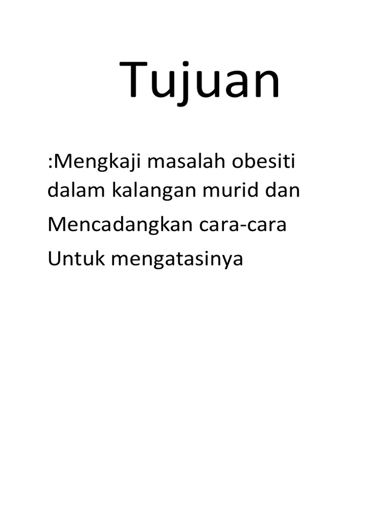 Cadangkan cara untuk menyelesaikan masalah ini di peringkat sekolah. Hubungkaitkan dengan pemakanan makanan diproses dan juga makanan rapu. Obesiti adalah masalah kesihatan bukan tanda kekayaan. Lebih dari 1 billion penduduk dunia gemuk.