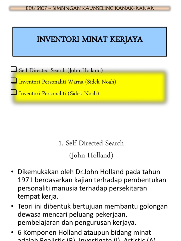 6 6 upvotes mark this document as useful 0 0 downvotes mark this document as not useful embed. Membantu individu memilih program pengajian yang sesuai. Beliau juga telah berjaya menghasilkan inventori personaliti sidek ips inventori minat kerjaya sidek imks dan inventori nilai pekerjaan sidek inps dan inventori personaliti warna ipw. Selain secara online anda boleh kenal pasti minat kerjaya anda menerusi inventori psikologi yang sama standardnya seperti self directed search sds strong interest inventory ujian minat kerjaya sidek dan profil personaliti tajma.