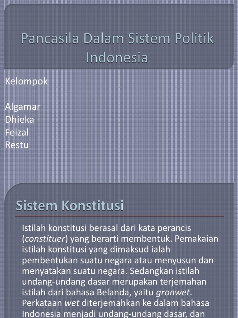 Pemakaian istilah konstitusi yang dimaksud ialah pembentukan suatu negara atau menyusun dan menyatakan suatu negara. Dalam bahasa indonesia wet diterjemahkan sebagai undang undang dan ground berarti tanah. Sistem konstitusi istilah konstitusi berasal dari bahasa perancis constituer yang berarti membentuk. Di negara negara yang menggonalcan bahasa inggris sebagai bahasa nasional dipakai istilah constitution yang artinya konstitusi.
