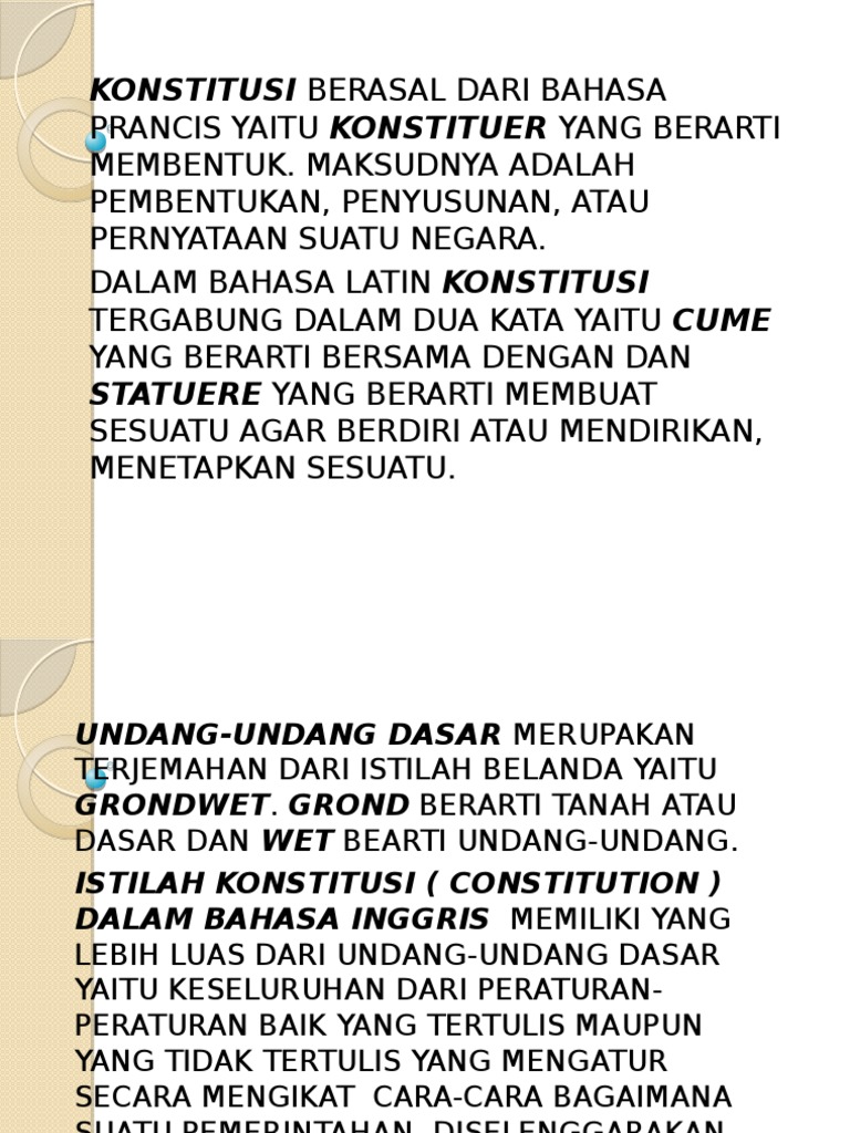 Istilah undang undang dasar merupakan terjemahan dari bahasa belanda yaitu. Dari segi bahasa istilah konstitusi berasal dari kata constituer prancis yang berarti membentuk maksudnya yaitu membentuk menata dan menyusun suatu negara. Sedangkan istilah undang undang dasar merupakan terjemahan dari bahasa belanda grondwet. Grond berarti dasar dan wet berarti undang undang. Sedangkan istilah undang undang dasar merupakan terjemahan istilah dari bahasa belanda grondwet.