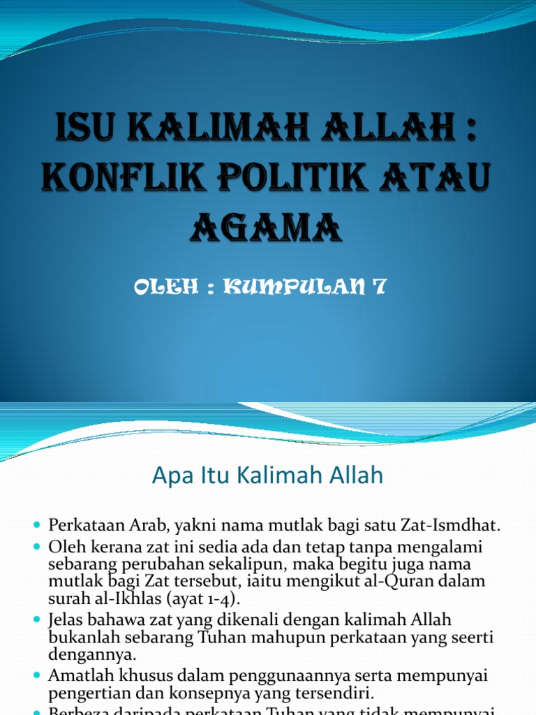 Penggunaan kalimah allah bagi golongan bukan islam dibentangkan oleh. 1 mohd toriq bin hj sulaiman. Keputusan kabinet pada mei 1986 yang telah memutuskan bahawa terdapat empat kalimah yang tidak dibenarkan penggunaannya oleh bukan islam iaitu allah ka bah baitullah dan solat. Membenarkan penggunaan kalimah allah oleh golongan bukan muslim dengan bersandarkan hukum asal semata mata akan menghasilkan suatu ketetapan hukum yang kurang berpaut kepada.