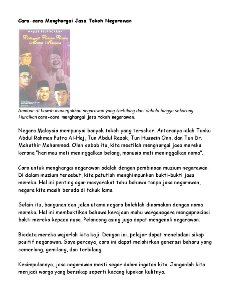 Karangan cara cara menghargai jasa pemimpin negara. Selain itu bangunan dan jalan utama negara bolehlah dinamakan dengan nama mereka. Antaranya ialah tunku abdul rahman putra al haj tun abdul razak tun hussein onn dan tun dr. Cara cara menghargai jasa tokoh negarawan negara malaysia mempunyai banyak tokoh yang tersohor. Para pemimpin perlulah selalu mengingatkan dan menekankan kepentingan menghargai kemerdekaan yang telah dicapai hasil perjuangan dan titik peluh pejuang pejuang kemerdekaan yang terdahulu dan menghayatinya dengan sepenuh hati.