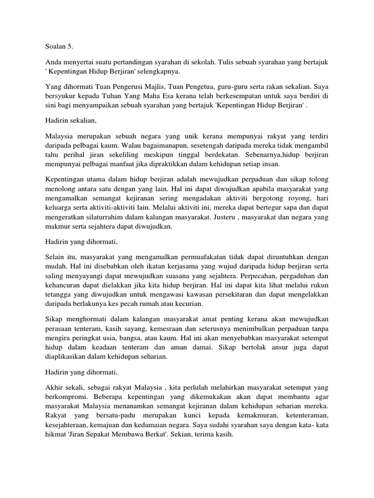 Karangan kepentingan hidup berjiran. Semangat kejiranan ini merujuk kepada tahap keakraban dalam hubungan sesama jiran. Pada masa kini semangat kejiranan amat jelas kelihatan dalam masyarakat luar bandar jika dibandingkan masyarakat bandar. Mengukuhkan semangat perpaduan dalam kalangan penduduk. Nusa tercinta kita malaysia merupakan negara yang mempunyai anak watan berbilang kaum dan hidup secara bersama sehati sejiwa ibarat seikat bak sirih serumpun bak serai.