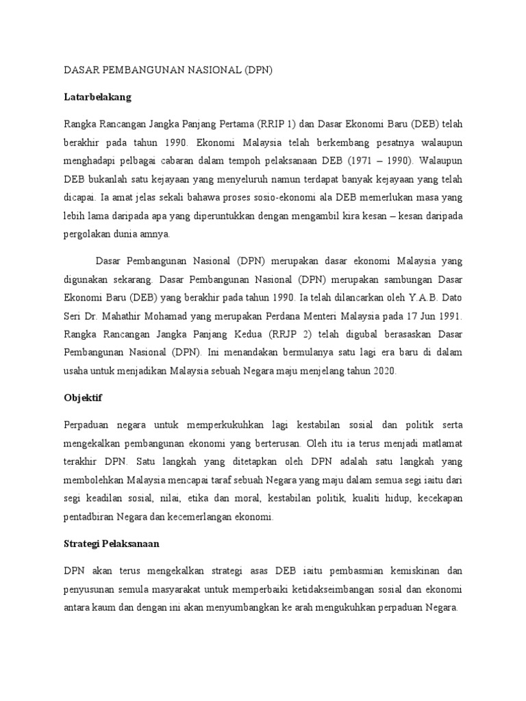 Dasar ekonomi baru 1 0 pendahuluan dasar ekonomi baru merupakan satu bentuk perancangan yang dilancarkan oleh kerajaan dalam tahun 1970 melalui rancangan malaysia kedua. Beberapa projek yang dilaksanakan dapat dilihat hasil kejayaannya seperti jurang ekonomi diantara kaum dapat dikurangkan dan semakin ramai rakyat malaysia yang mendapat peluang melanjutkan pelajaran mereka ke peringkat tertinggi hasil daripada pelbagai bantuan yang telah disalurkan oleh kerajaan walaubagaimanapun terdapat beberapa kepincangan dalam pelaksanaan deb kerana masih terdapat kes. Matlamat utamanya ialah perpaduan negara selain itu juga bertujuan untuk menyusun semula ketidakseimbangan sosio ekonomi yang wujud di negara ini. 1971 1990.