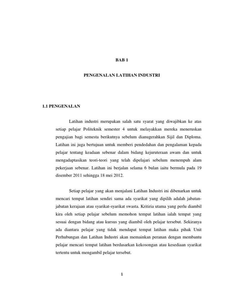 1 1 3 kepentingan latihan industri latihan industri adalah bertujuan memberikan peluang kepada para pelajar untuk lebih memahami alam pekerjaan yang sebenar. Latihan ini juga bertujuan untuk memberikan pendedahan dan pengalaman kepada pelajar tentang keadaan sebenar dalam bidang teknologi maklumat pengaturcaraan dan sebagai persediaan awal bagi pelajar sebelum melangkah ke alam pekerjaan. Kepentingan latihan industri tanpa latihan industri seseorang pelajar itu tidak akan mempraktikkan segala kemahiran yang telah diperolehi. Laporan latihan industri juga berperanan untuk dijadikan bukti atau dokumen sokongan ketika menghadiri sesi temuduga sebenar kelak.