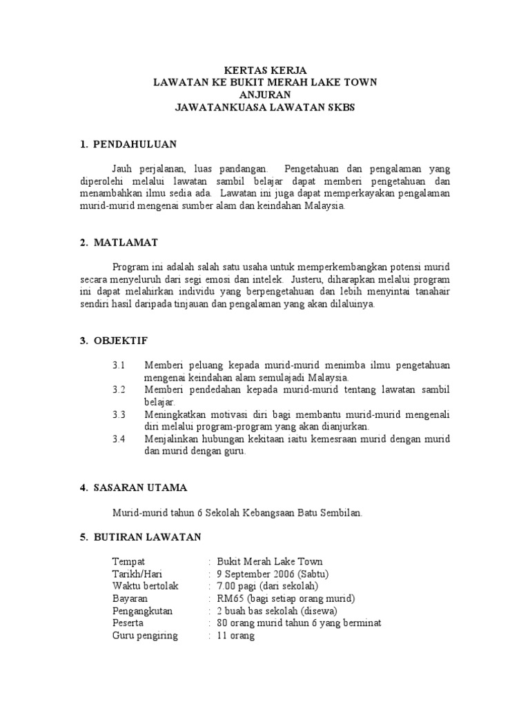 Kertas kerja contoh proposal lawatan. Program lawatan sambil belajar. Kertas kerja lawatan ke rumah orang tua. Pusat dagangan dunia putra pwtc 41 jalan tun ismail 50480 kuala lumpur malaysia. Sebenarnya ada banyak contoh lain yang lebih baik tapi ini kk yang biasa ca gunakan sekadar berkongsi buat teman2 guru yang bertanyakan ca tentang proses melaksanakan lawatan terutamanya lawatan ke uss.