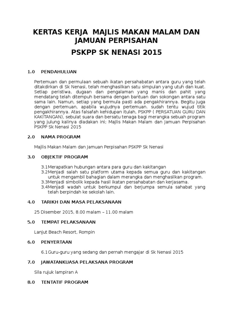 Kertas kerja makan malam. Untuk diedarkan kepad semua jemputan. 1 kertas ini disediakan adalah bertujuan untuk m endapatkan pandangan dan pertimbangan ahli mesyuarat berhubung cadangan pelaksanaan program majlis makan malam amal bersama kumpulan nasyid far east mengisi tabung kecemerlangan sekolah sma al hasanah tahun 2014. Related posts to contoh kertas kerja majlis makan malam syarikat contoh kertas kerja majlis makan malam syarikat 2017 12 08t14 41 00 08 00 rating. Jamuan makan malam 19 november 2015 anjuran unit kokurikulum sk hermanus assan kertas konsep jamuan makan malam sk hermanus assan 2015 1 0 latar belakang program jamuan makan malam ini adalah salah satu projek yang dianjurkan oleh unit kokurikulum sk hermanus assan sebauh bagi tahun 2015.