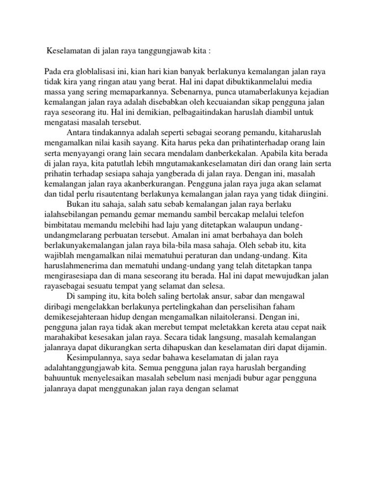 Bandar seri begawan 11 feb keselamatan jalan raya adalah tanggungjawab semua pengguna jalan raya di mana pemandu kereta harus peka dengan pelari atau pejalan kaki dan pada masa yang sama pengguna jalan raya lain seperti pejalan kaki pelari penunggang basikal juga harus peka serta berwaspada terhadap pemandu kenderaan. Mendidik masyarakat di usia muda supaya berhemah di jalan raya sekaligus dapat mengurangkan kadar kemalangan jalan raya. Keselamatan jalan raya tanggungjawab bersama. Mutakhir ini hampir setiap hari media massa menyiarkan berita mengenai kemalangan jalan raya dan berita ini sering terpampang di dada akhbar sebagai isu polemik yang mempunyai kadar kemalangan yang tertinggi di negara malaysia hal ini demikian telah menyebabkan ramai pengguna jalan raya yang.