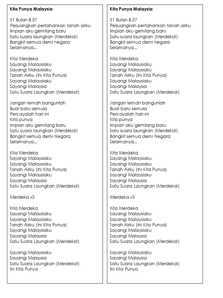 Lirik lagu sayangi malaysiaku. Sayangi malaysiaku sayangi malaysiaku tanah airku ini kita punya sayangi malaysiaku sayangi malaysia satu suara laungkan merdeka sayangi malaysiaku sayangi malaysia satu suara laungkan merdeka ini kita punya sumber instagram bunkface. Lirik lagu kita punya malaysia lagu tema hari kemerdekaan 2018 by adi channel 31 bulan 8 57. Enjoy the videos and music you love upload original content and share it all with friends family and the world on youtube. Muhammad yuri mohamed edris lirik.