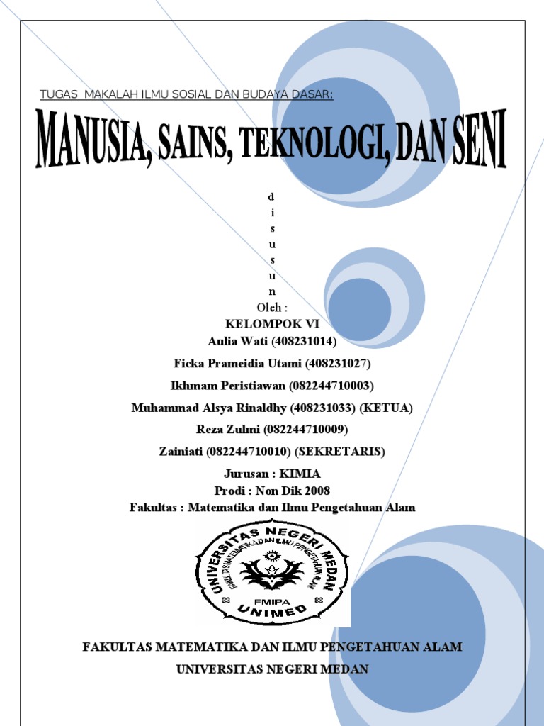 Manusia sains teknologi dan seni selama perjalanan sejarah umat manusia sudah berhasil menciptakan berbagai ragam kebudayaan. Teknologi berkembang di mulai sejak dulu kala sampai sekarang seiring dengan kemajuan peradaban manusia pada awalnya teknologi hanya bersifat kebendaan dan berhubungan dengan tugas eksploitasi dan pengolahan sumber daya alam berupa materi dan energi seperti kapak tombak panah dan peralatan lain sedang cara cara pembuatan rumah perahu alat alat rumah tangga makanan minuman obat obatan dan lain. Tugaskuliah15 makalah isbd manusia sains teknologi dan seni kali ini saya akan share makalah isbd manusia sains teknologi dan seni hal pertama yang akan dibahas dalam makalah ini ialah mengenai makna dari manusia sains teknologi dan seni dalam kehidupan. Hubungan manusia dengan sains dan teknologi merupakan hal yang biasa karena manusia tidak akan lelah akan keinginannya serta sains merupakan sumber ilmu yang tidak ada habisnya dan teknologi merupakan ciptaan karya dari manusia tersebut.