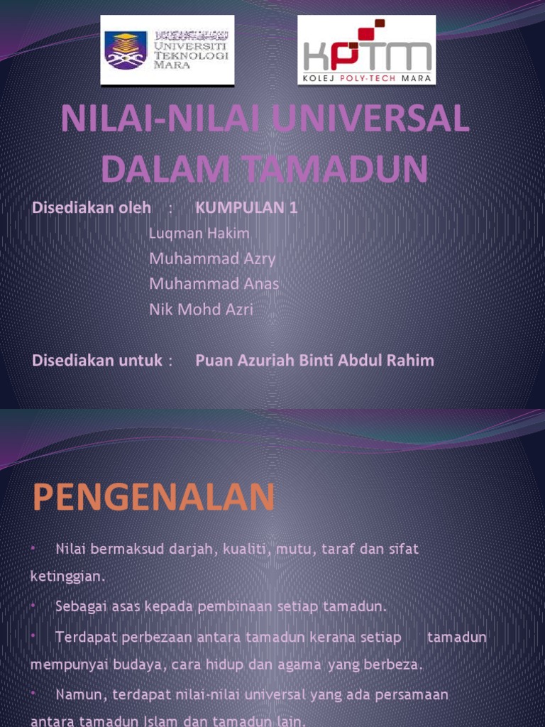 Nilai nilai universal dalam tamadun. Nilai universal nilai yang sesuai dipraktikkan bila bila masa dan di mana mana sahaja demi kesejahteraan ummah nilai darjah kualiti mutu taraf dan sifat ketinggian. Kesetiaan dan pertalian erat amat penting 5 bentuk hubungan pemerintah dan rakyat ayah dengan anak abang dengan adik sahabat dengan sahabat suami dan isteri. Tamadun islam tamadun islam yang berasaskan ajaran al quran memberi kepentingan dalam hubungan kekeluargaan. Nilai nilai universal dalam tamadun melayu nilai nilai definisi nilai universal bermaksud suatu nilai atau sifat yang boleh didapati dalam sesebuah tamadun.