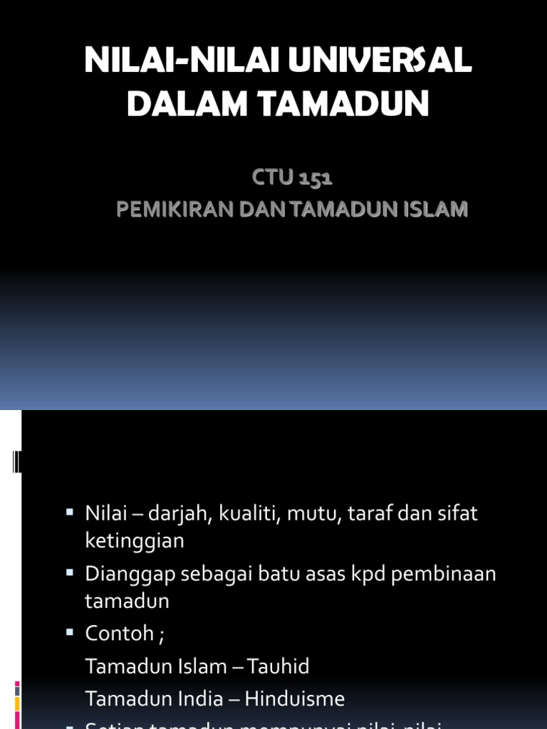 Tamadun islam tauhid tamadun india hinduisme setiap tamadun mempunyai nilai nilai universal yang dikongsi bersama universal shared values. Nilai nilai universal dan interaksi antara tamadun 1. Persamaan dan perbezaan nilai sesebuah tamadun bergantung kepada perkara yang menjadi pegangan secara menyeluruh dalam tamadun tersebut. Tamadun islam berpaksi kepada sumber wahyu yang mengarahkan semua perkara yang dilakukan oleh umatnya perlu berada pada landasan wahyu.