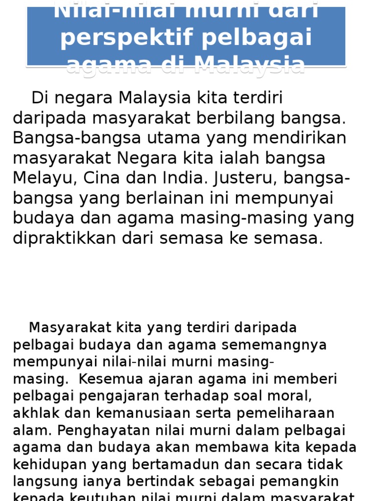 Pelbagai agama di malaysia. Elemen agama sememangnya memainkan peranan penting bagi membentuk perpaduan dalam kalangan masyarakat malaysia. Dalam konteks malaysia yang terdiri daripada pelbagai kaum dan agama ramai tetap cintakan perdamaian dan keharmonian termasuk dalam mengamalkan agama masing masing dan dalam pendekatan mereka ketika membicarakan isu isu agama di dalam masyarakat dan di kalangan meraka sendiri. Oleh kerana itu rakyat malaysia perlu mematuhi undang undang negara yang menekankan tentang kepentingan menghormati agama dan budaya di negara ini. Malah terdapat dalam kalangan mereka yang mengamalkan dua atau lebih ajaran konfusianisme buddha dan taoisme dalam masa yang sama.