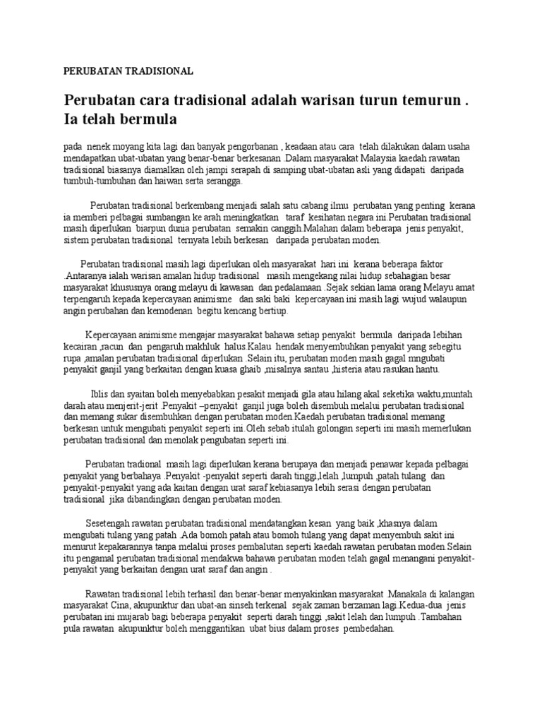 Perubatan moden vs perubatan tradisional alternatif komplimentari banyak kaedah rawatan penyakit telah dicipta oleh manusia. Justeru itu pengamal pengamal perubatan alternatif seolah olah datang ke hospital berlagak lebih pandai daripada doktor doktor yang sedia ada dan bagi tujuan mengambil alih tugas para doktor tersebut. Amat malang sekali sistem perubatan tradisional tidak mempunyai ruang untuk menyumbang jasa walaupun sebelum kehadiran sistem perubatan moden merampas takhta dunia perubatan sistem perubatan tradisional turut memainkan peranan penting dalam menangani dan membendung masalah penyakit sehinggakan penyakit penyakit yang kronik dapat diubati dengan sempurna menyebabkan pesakit pesakit yang pernah. Pada pertanian tradisional biasanya hanya dilakukan untuk memenuhi kebutuhan sehari hari petaninya.