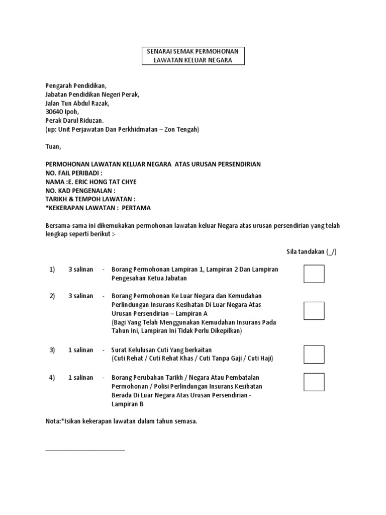 Untuk memudahkan segala urusan sila rujuk garis panduan dan peraturan untuk perjalanan ke. Senarai semak kln p 01 2016 senarai semak permohonan cuti persendirian ke luar negara nota. Tempat permohonan adalah berdasarkan kepada alamat yang tertera dalam mykad atau alamat tempat tinggal di malaysia warganegara asing. Borang permohonan kelulusan perjalanan atas tugas rasmi ke luar negara mengikut pekeliling perbendaharaan malaysia pb 2 4 dan pb 3 1 lampiran a1.
