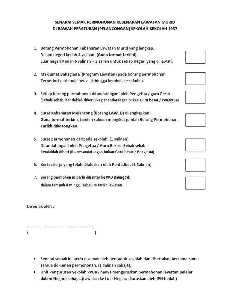 Senarai semak permohonan ke luar negara. Luar negara surat kebenaran. Perkara dokumen sila tanda pemohon bahagian p i 1 borang permohonan lengkap dan ditanda tangani oleh pemohon 2 surat jemputan dokumen pengesahan penerimaan kertas kerja 3 abstrak kertas kerja 4. Salinan borang 2a dan dokumen sokongan jika pemohon bernikah di luar daerah negeri negara. Penyediaan permohonan kelulusan bertugas ke luar negara tahun 20 nama jabatan.