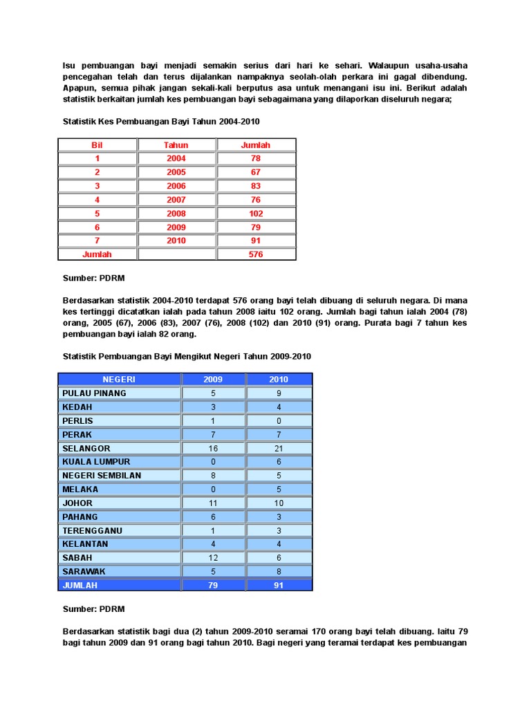 Negeri selangor mencatatkan jumlah kes tertinggi iaitu sebanyak 135 kes dalam tempoh lima tahun itu diikuti sabah 67 kes johor dan kuala lumpur 62 kes kedah 42 kes perak 35 kes dan pahang 33 kes. Pdf pembuangan bayi. Subscribe to njoi awani. Terdapat faktor lain yang menjadi punca masalah pembuangan bayi selain daripada kepincangan keluarga terhadap gejala pembuangan bayi serta huraiannya dalam pelbagai sudut seperti.