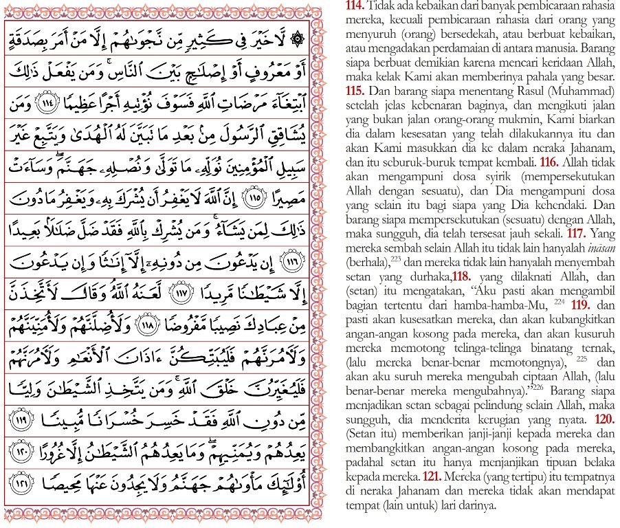 Padahal najwa itu tidak ada baiknya kecuali menyuruh bersedekah. An nisa 4 page 97 verses 114 121 mishary. Hal itu karena dia setelah mengetahui kebenaran namun malah meninggalkannya oleh karena itu allah membalasnya dengan adil yaitu dengan membiarkannya di atas kesesatan dan kebingungan dan kesesatannya akan semakin bertambah. Syirik adalah yang lain dari dosa dosa yang telah disebut sebelum ini.