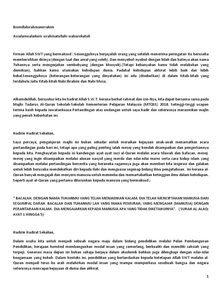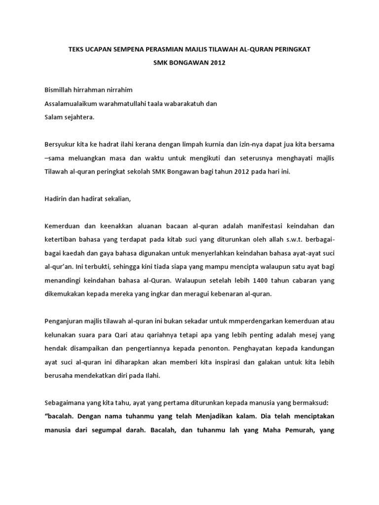 Teks ucapan perasmian majlis tilawah al quran. Teks ucapan majlis khatam al quran. Penghayatan kepada isi kandungan ayat ayat suci al quran melalui acara tilawah dan hafazan. 100 4 100 found this document useful 4 votes. Teks ucapan yab tun dr.