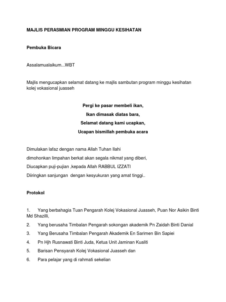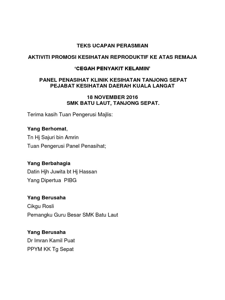 Teks ucapan perasmian program kesihatan. Tanpa penyertaan dari tuan tuan dan puan puan sekalian niosh tidak akan dapat melaksanakan tugas dan tanggungjawab yang di amanahkan kepadanya dengan jayanya. Teks ucapan perasmian yb menteri kesejahteraan bandar perumahan dan kerajaan tempatan di majlis perasmian persidangan kesihatan persekitaran pihak berkuasa tempatan sempena hari kesihatan persekitaran sedunia 2015 pada 8 september 2015 rabu bertempat di ujana kewangan labuan. Assalamualaikum w b t dan salam sejahtera salam 1malaysia. Kalumpang membantu menjayakan program promosi kesihatan dan mengharapkan program tersebut akan dapat mengukuhkan lagi hubungan silaturahim dikalangan penduduk kampung dengan pelajar yang terlibat.
