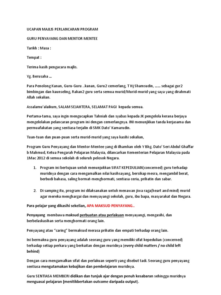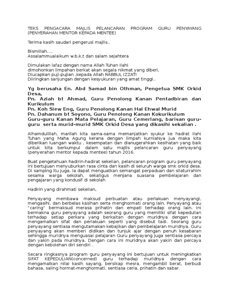 Teks ucapan perasmian program mentor mentee. Program mentor mentee ini bertujuan untuk menentukan bahawa setiap murid itu mempunyai orang yang lebih arif yang boleh dirujuknya dan mendapatkan bimbingan dan bantuan dalam menyelesaikan masalah. Teks pengacara majlis perhimpunan rasmi pelancaran program mentor mentee guru penyayang 2016. Gimik pelancaran persembahan murid. Majlis watikah pelantikan mentor.