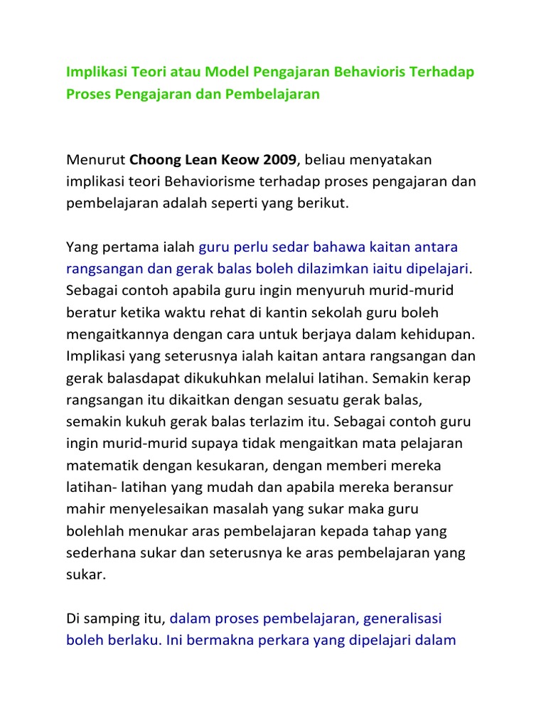 Teori behaviorisme dalam pengajaran dan pembelajaran. Dalam pembelajaran ilmu pengetahuan alam teori belajar behaviorisme yang berpedoman pada perubahan tingkah laku setelah melakukan pembelajaran dapat diterapkan dengan menggunakan stimus stimulus yang dapat membangkitkan semangat siswa dalam belajar dan mampu merangsang siswa untuk merubah perilakunya sesuai dengan tujuan pembelajaran yang ingin dicapai. Watson ahli ahli psikologi behavioral menyatakan pembelajaranmerupakan perubahan tingkah laku dalam diri seseorang individu yangdisebabkan oleh pengalaman. Penyajian materi lebih banyak dengan hiwar lebih banyak melakukan peniruan dan menghafal idiom idiom menyajikan satu kalimat dalam satu situasi tidak menyajikan strukstur nahwu secara terpisah dan lebih baik dengan sistem deduktif lebih menitik beratkan pada ujaran lebih banyak menggunakan bahasa dalam. Teori ini mempengaruhi perkemabangan teori belajar dan pelaksanaannya dalam pembelajaran yang disebut sebagai teori belajar behavioristik.