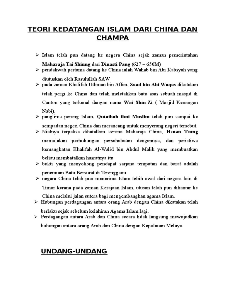 Laporan ini menjadi pegangan kuat sq fatimi bagi membuktikan teori kedatangan islam dari china selain dari dua batu nisan tersebut. Teori kedatangan islam dari tanah arab pedagang arab mempunyai pusat perdagangan di canton dan amoy. Teori dan bukti kedatangan islam dari china 1 teori ini dikemukakan oleh. Teori cina mengatakan bahwa proses kedatangan islam ke indonesia khususnya di jawa berasal dari para perantau cina.