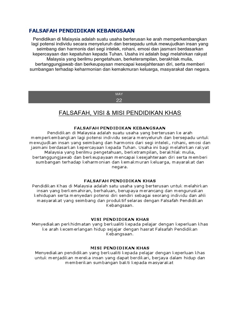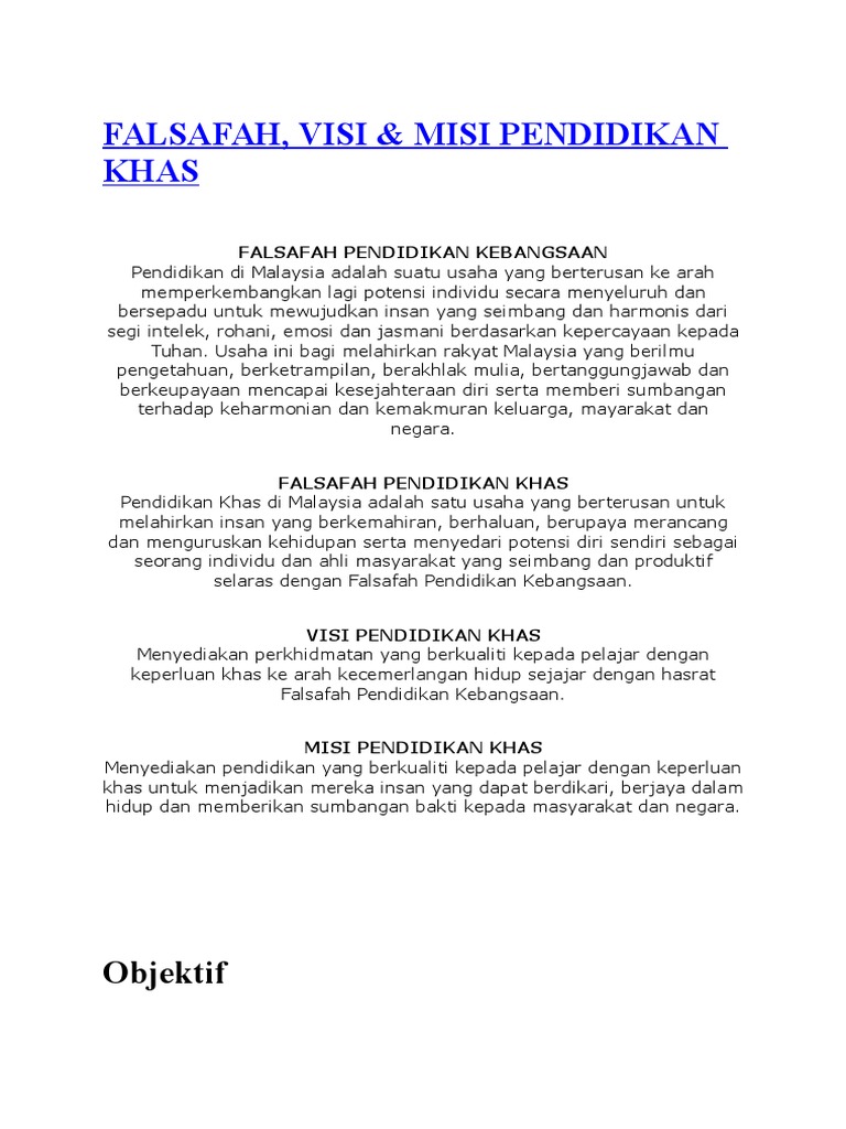 Visi dan misi pendidikan khas di malaysia. Falsafah visi dan misi falsafah pendidikan khas pendidikan khas di malaysia adalah satu usaha yang berterusan untuk melahirkan insan yang berkemahiran berhaluan berupaya beriman berdikari mampu merancang dan menguruskan kehidupan serta menyedari potensi diri sendiri sebagai seorang individu dan ahli masyarakat yang seimbang dan produktif selaras dengan falsafah pendidikan negara. Falsafah pendidikan kebangsaan pendidikan di malaysia adalah suatu usaha yang berterusan ke arah memperkembangkan lagi potensi individu. Pendidikan berkualiti insan terdidik negara sejahtera. Misi visi dan objektif pendidikan khas.